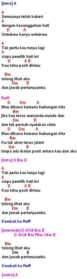 C semuanya telah kuberi c dengan kesungguhan hati f c untukmu hanya untukmu. B m tolong lihat aku dan jawab d m pertanyaan e ku chorus mau d dibawa d m kemana hubungan a kita jika kau b m. D dm mau dibawa kemana.