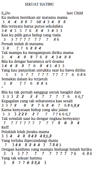 Ku mohon hentikan air matamu mama cm bila ternyata harus putus sekolahku a dan ku pilih gaya hidup yang tiada e b pernah indah di matamu. Chord last child sekuat hatimu intro. Cfamfcg2x c ku mohon hentikan air matamu mama f bila ternyata harus putus sekolahku am f dan ku pilih gaya hidup yang tiada c g pernah indah.