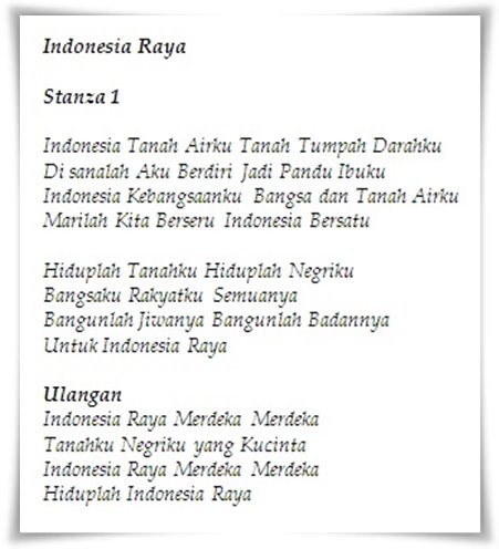Barangkali banyak orang tak tahu bahwa sejak diciptakan lagu kebangsaan indonesia raya ternyata memiliki tiga stanza yang jarang didengar. Sekedar berbagi pengetahuan silahkan dikoreksi jika salah berikut ini 3 tiga stanza lagu kebangsaan indonesia raya sesuai pp nomor 44 tahun 1958 tentang tentang lagu kebangsaan indonesia raya. Lagu indonesia raya ciptaan wage rudolf supratman yang populer dan dikenal dan akrab dengan telinga masyarakat indonesia hanya memiliki satu stanza.